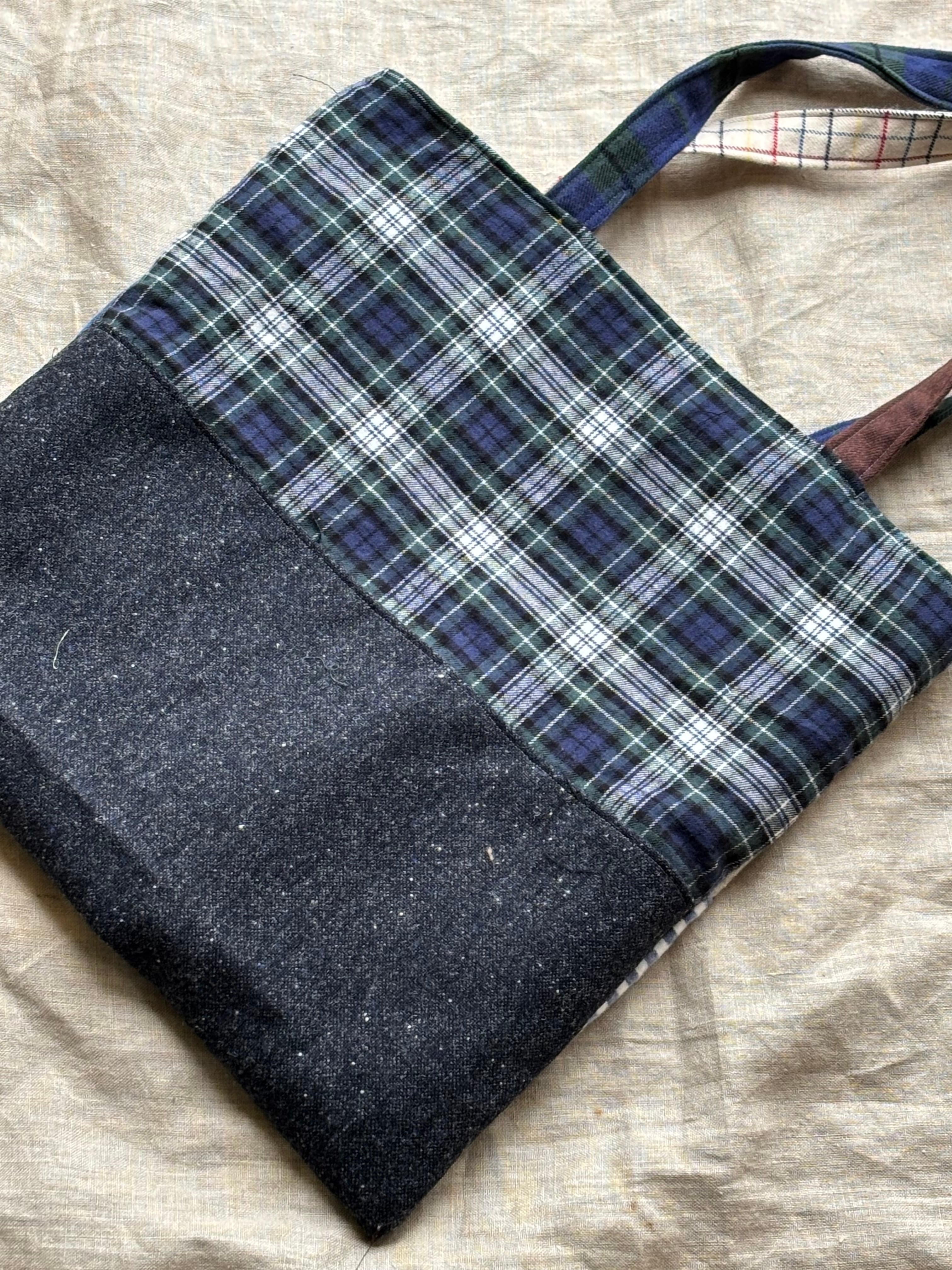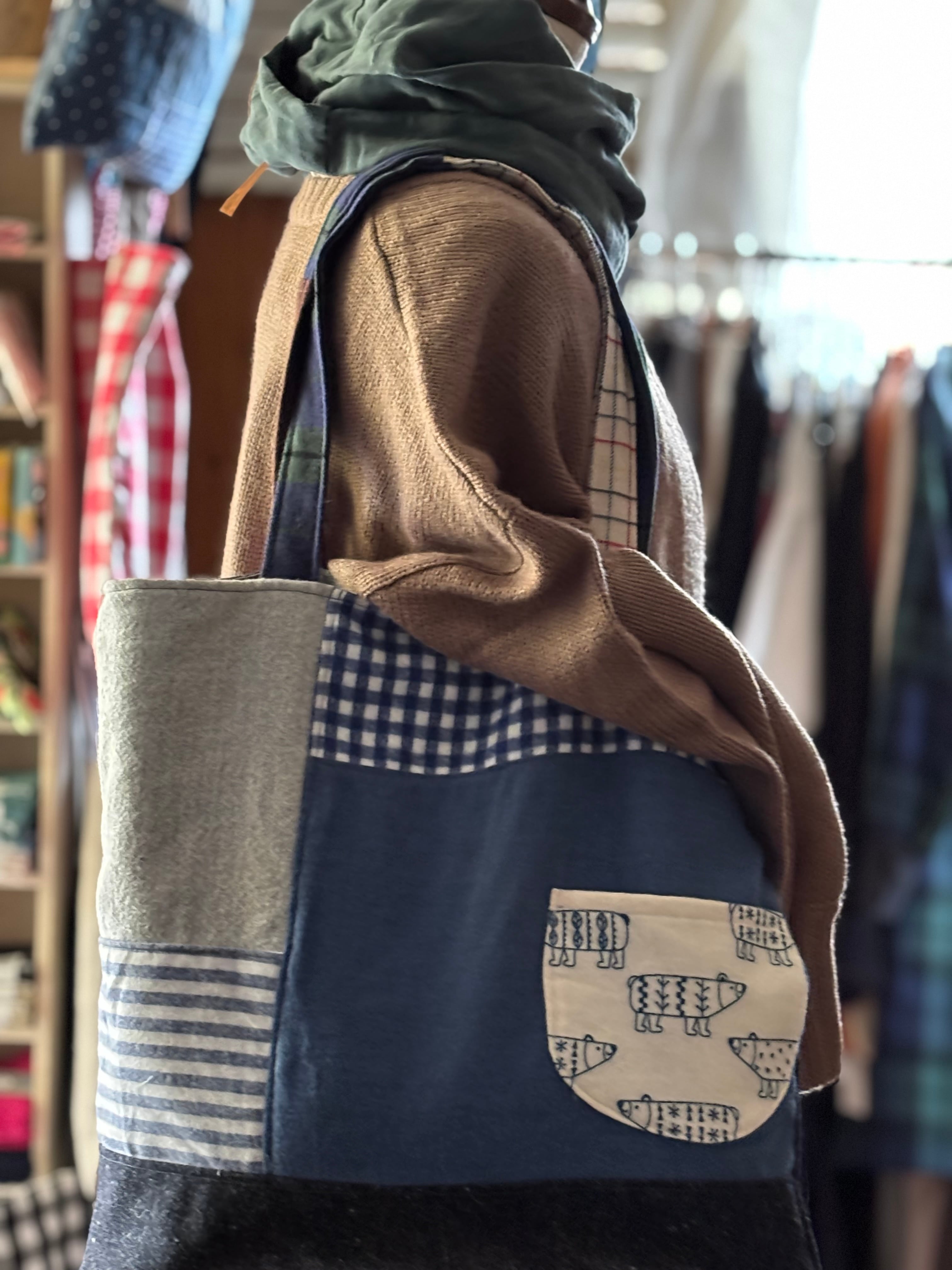 秋冬パッチバッグ①青ブルー系 肩掛けトートバッグ ハンドメイドバッグ