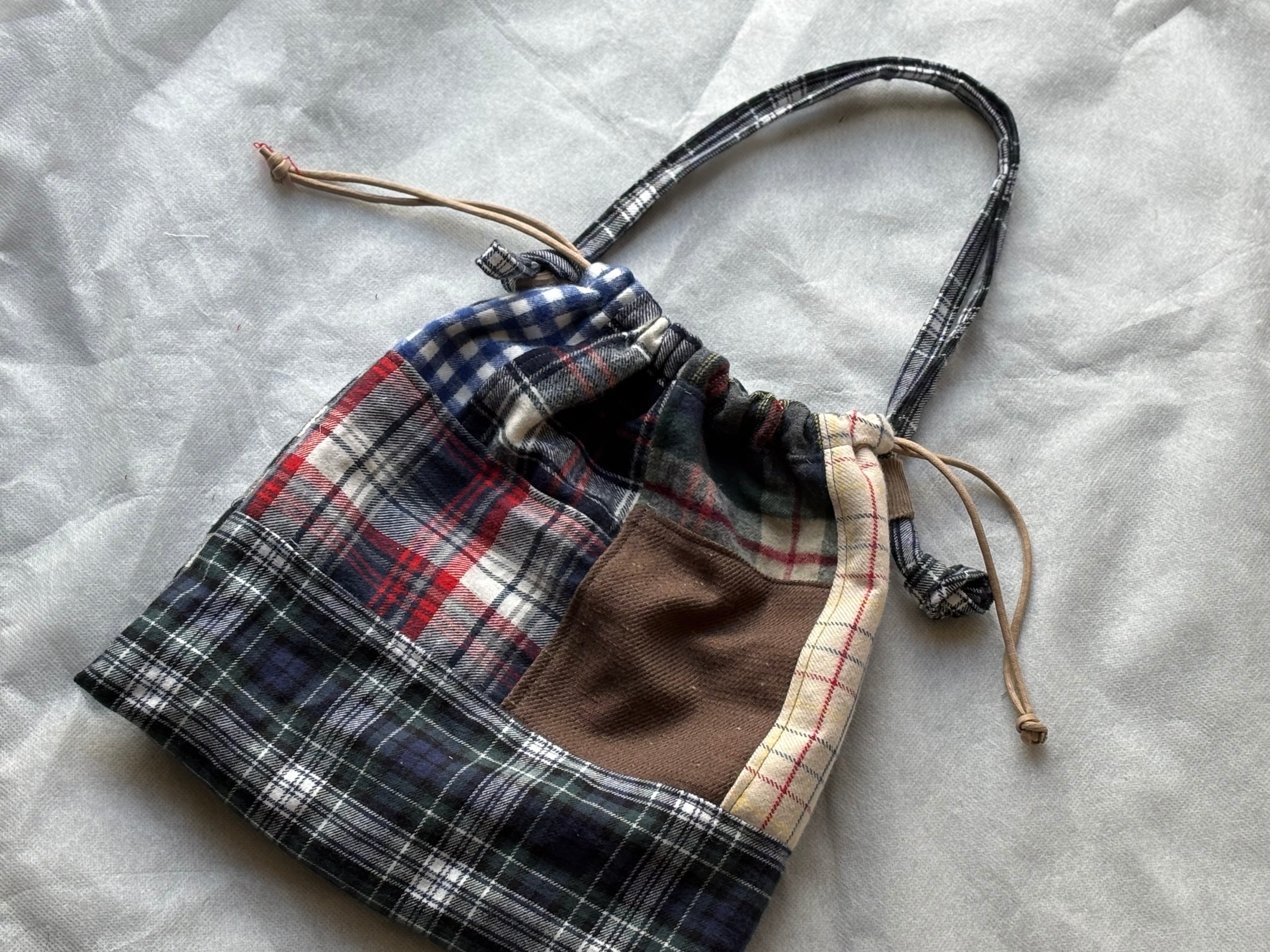 約h28×w27cm。持ち約28〜90cm(長さ調節可能)/起毛コットンフランネル等の冬生地. 内布はダブルガーゼ.内外ポケット付/製作:agnelet