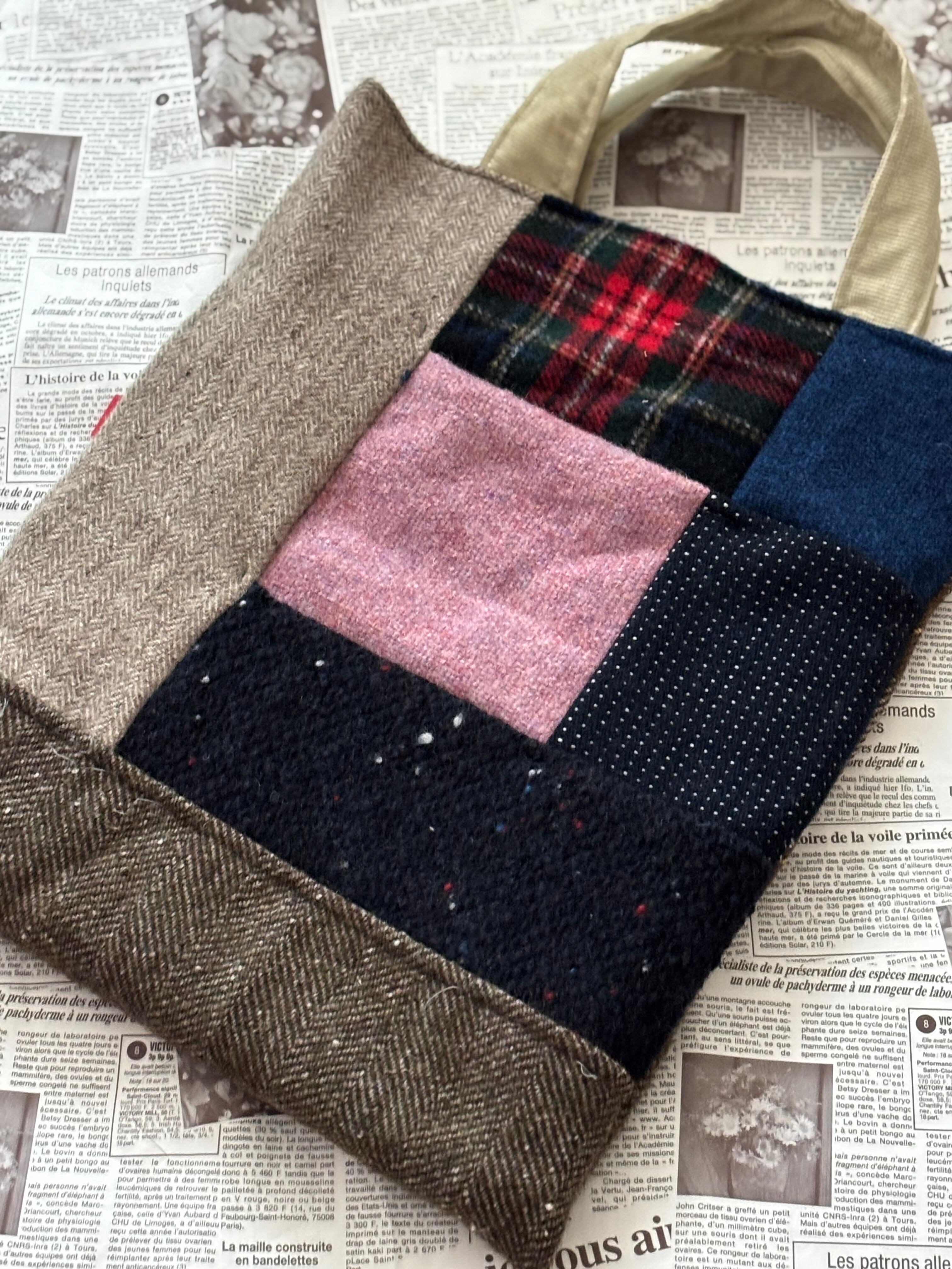 約h35×w29×d1。持ち手約26cm/ウール、コーデュロイ等の冬生地. 内布は綿麻.内外ポケット付/製作:agnelet