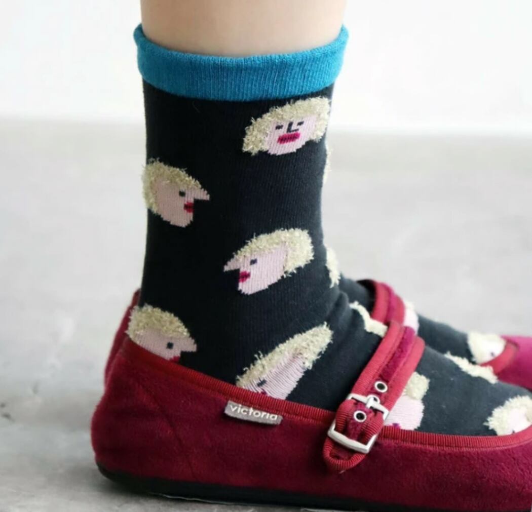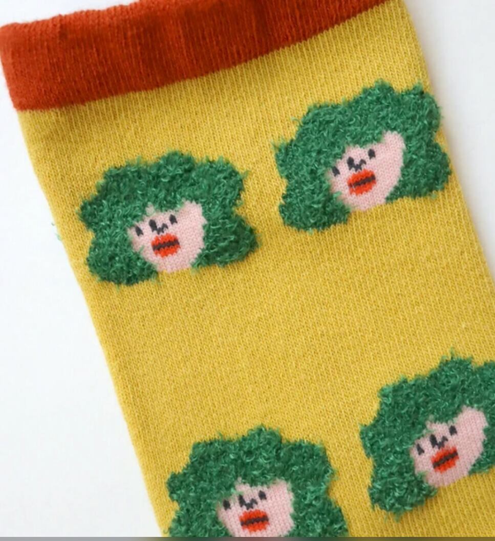 髪がふさふさな女の子たちがぎっしり並んだ、ユニークな総柄ソックス。スカートからちらっと見えるだけでも、ちょっと目を引くデザインです。履くだけで遊び心たっぷりのコーデに。履き口は柔らかく編みたてています◎