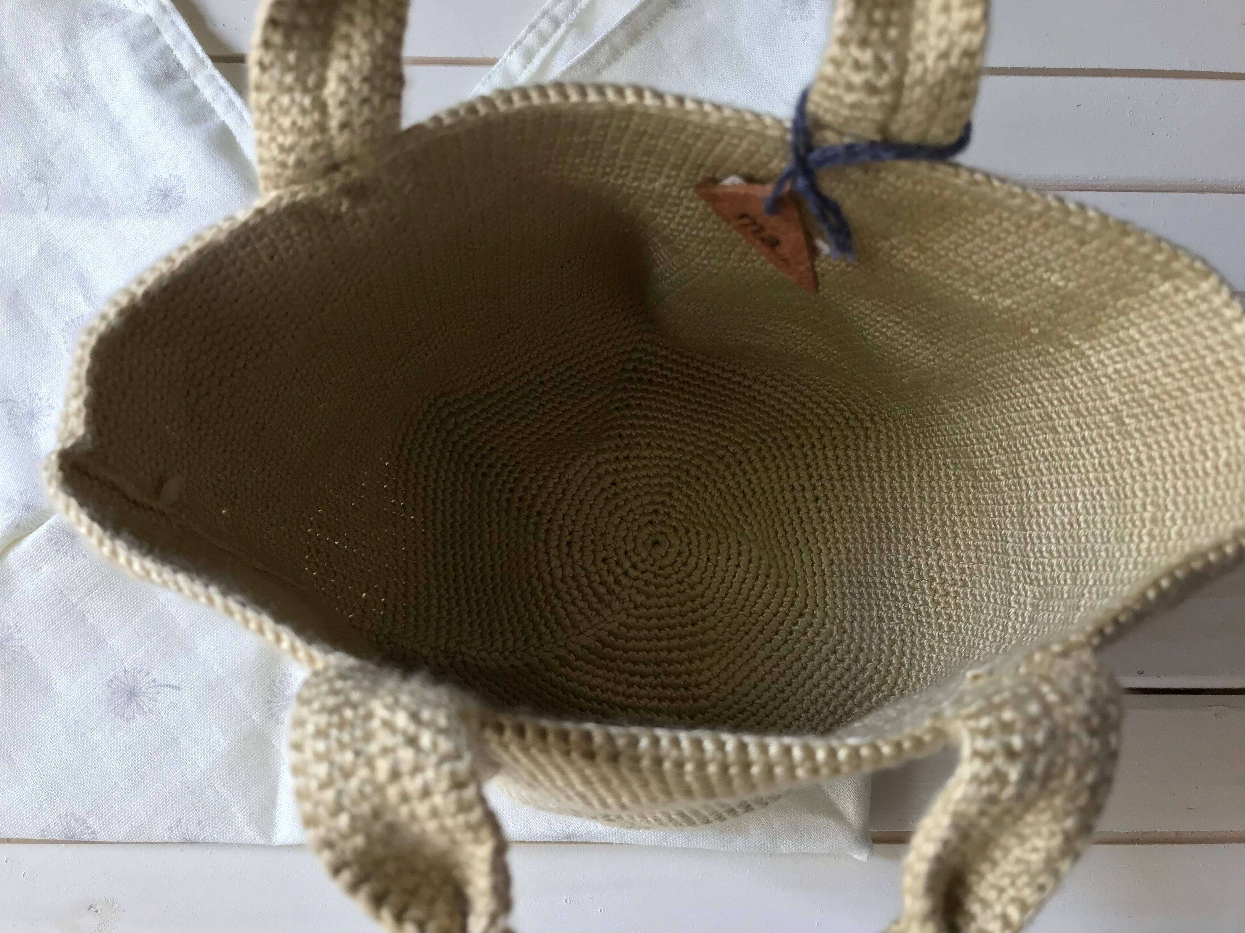 6号レース針を使ってかっちり編んでいて、とても丈夫なバッグです。小さいバッグになりますのでサイズをご確認ください。あずま袋はたんぼぼ綿毛柄。とても可愛いです。