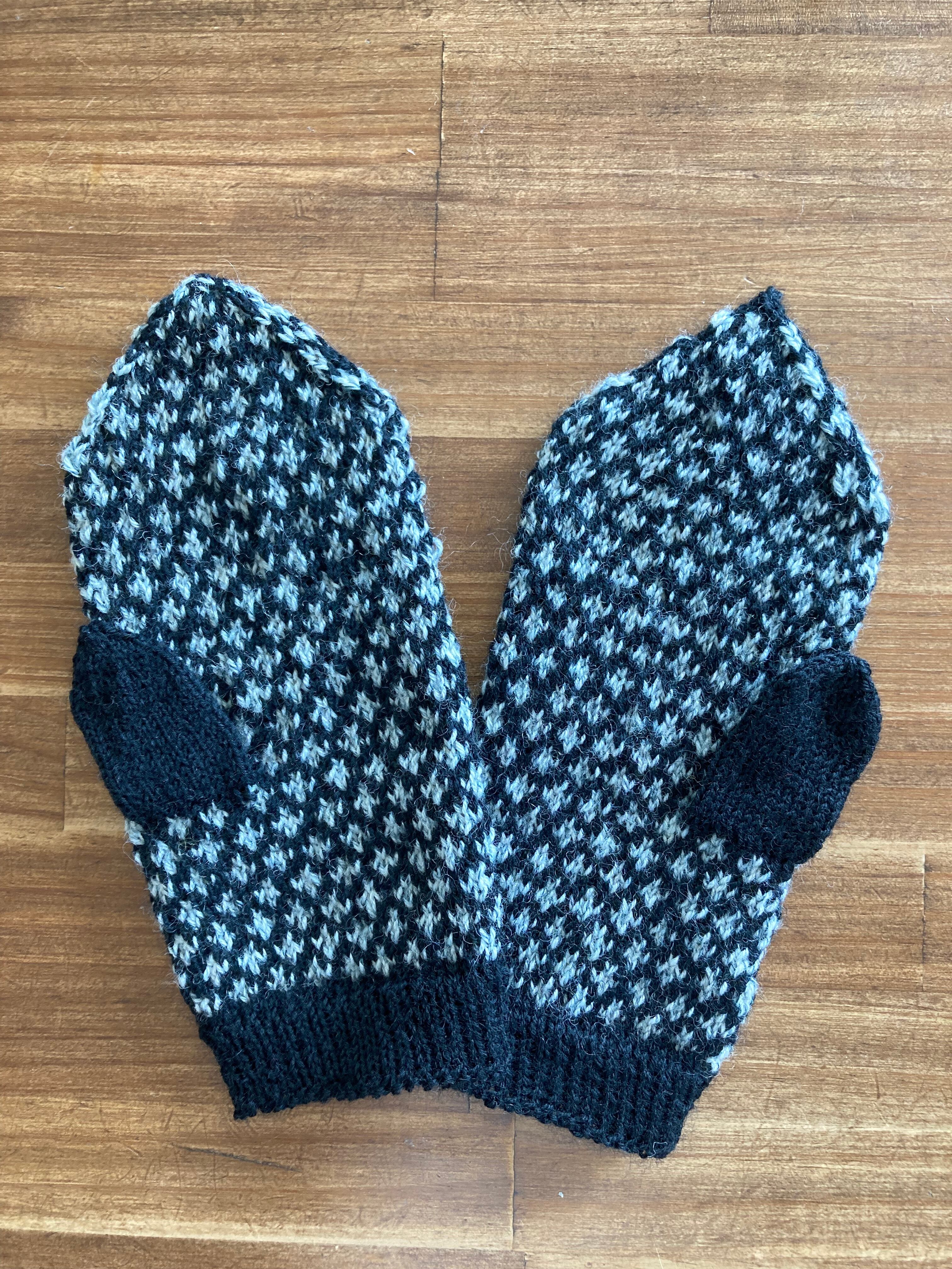 手編みのミトン 編み込み 黒×白×青 北欧 手袋 mayuca