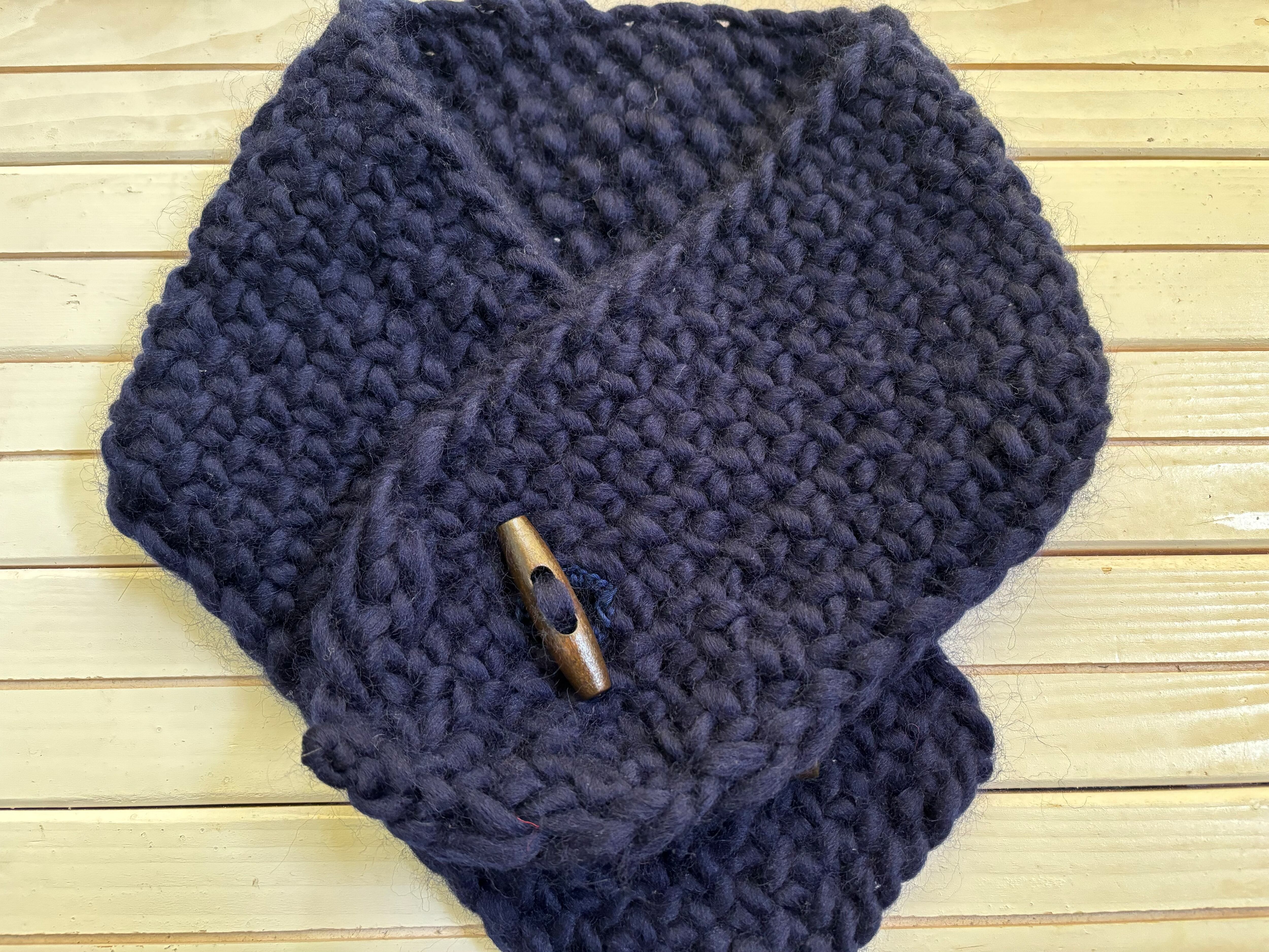 ボタンで2段階長さを調整できます。/極太ウール100% ウッドボタン/制作:無二屋
