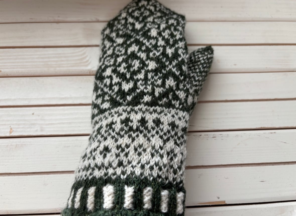 手編みのミトン編み込みグリーン×白 北欧 手袋 mayuca